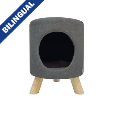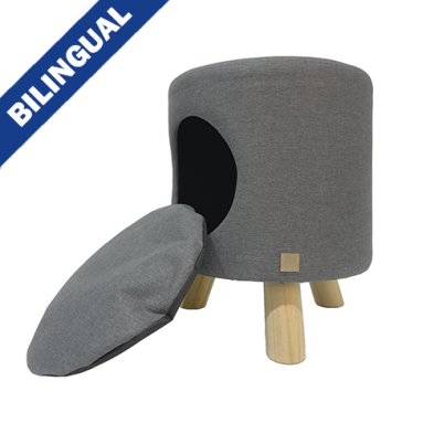 Polyester fabric stool and pet nook with wooden legs. A versatile and functional piece that serves as both a foot stool and seating stool. Featuring soft and plush interior that provides a cozy retreat for your fur family member to curl up and relax. The minimalist design of the Wallie is sure to complement any decor, whether it's placed in the living room, bedroom, or even in a home office.