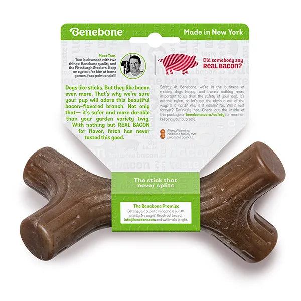 Each bacon stick is made with 100% USA sourced nylon and wood from the sugar maple and made in New York. Safe for chewing and free of chemicals or artificial colours. Please note that these toys are not considered edible, so we recommend supervision when choosing this toy for playtime.