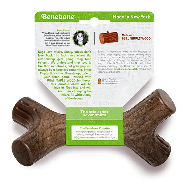 Benebone Maplestick is a unique chew that takes a dog's favourite and natural outdoor chew, the stick, and infuses it with nylon to create a safe, durable and ergonomic toy. This stick shape chew is designed to be easy for your dog to pick up and get chewing right away without the need to worry about the mess or splinters afterwards.