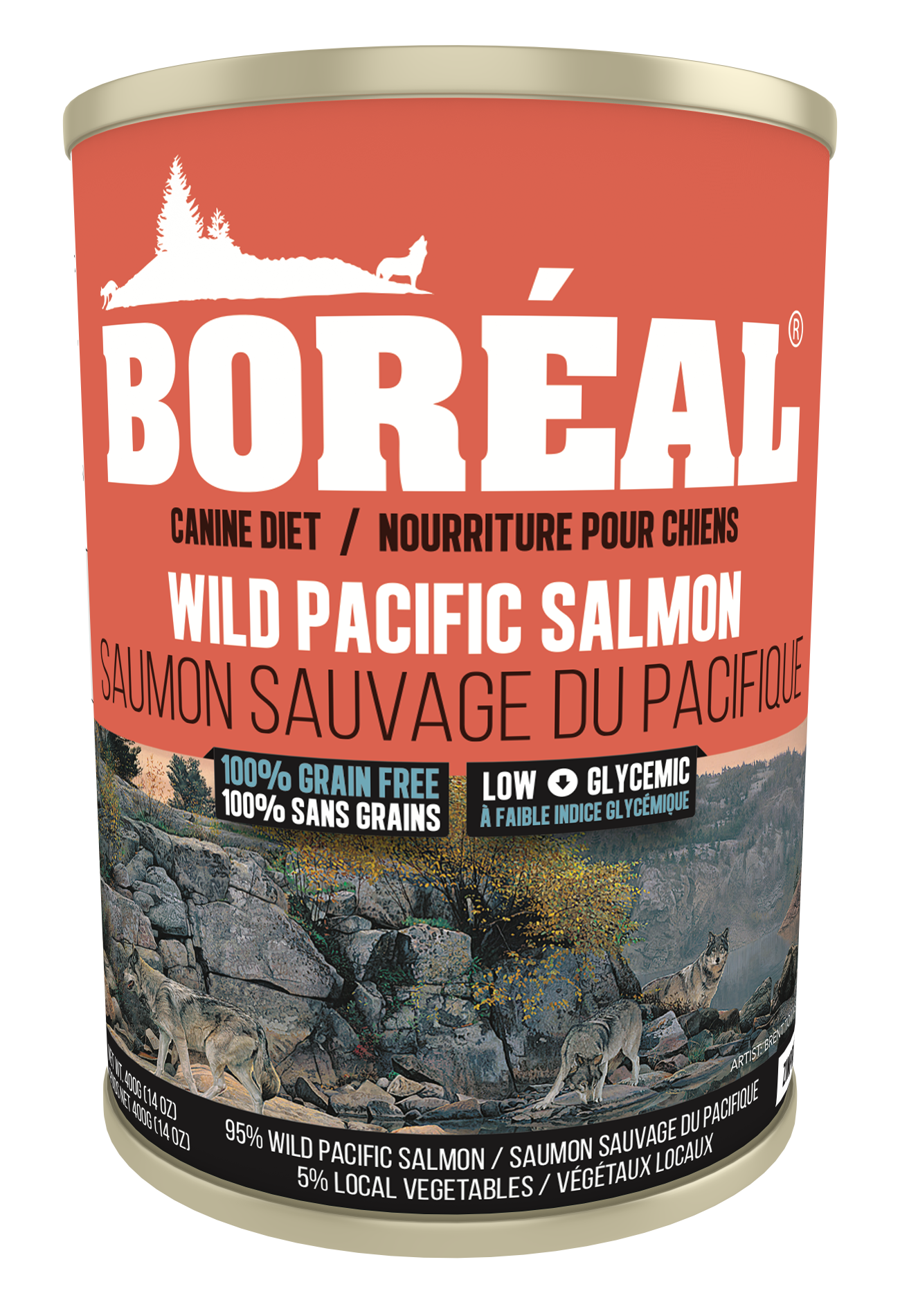 Our Boréal Big Bear canned Wild Pacific Salmon dog food is 90% Meat/Fish and is designed to have almost no carbohydrates or starches and lowers the risk of unwanted weight gain. Our Wild Pacific Salmon dog food is made from salmon caught in British Columbia, we do not use farmed salmon. Our canned dog foods a free of cereals, grains, starches, artificial colour or added salt.
