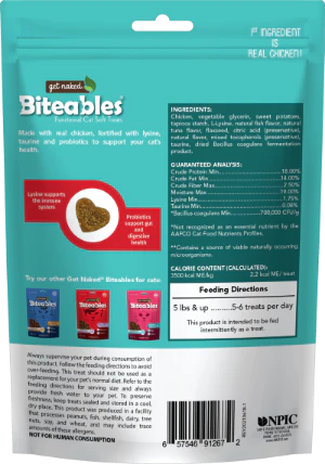 These multifunctional soft treats include lysine, probiotics, and flaxseed to help support your cat's immune system, gut, and digestive health. Your cat will enjoy the antioxidant and regulating benefits of Biteables Cat Health Plus while enjoying the delicious chicken and tuna recipe.