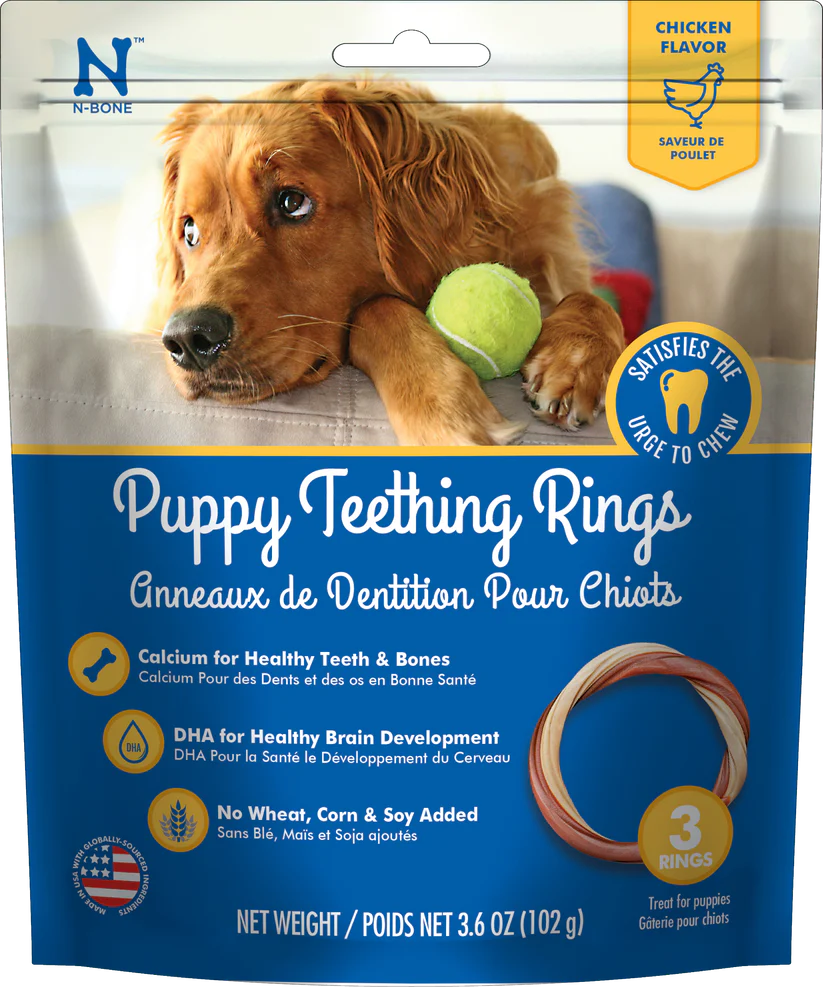 Growing new teeth is tough work and it makes for some sore gums! Sore gums and a strong urge to chew while cutting new teeth can turn your precious puppy into a whirlwind of destruction. N-Bone® Puppy Teething Rings are easy for floppy puppy paws to hold onto and provide a soothing and appropriate outlet for chewing. Formulated with DHA and calcium to support your puppy’s unique nutritional needs, our delicious peanut butter flavored rings are pliable and won’t damage immature teeth or upset tummies that have gluten sensitivity.