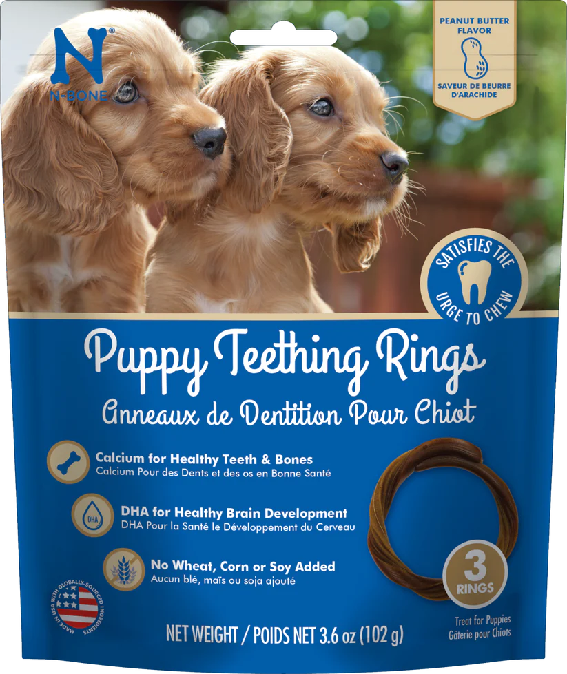 Growing new teeth is tough work and it makes for some sore gums! Sore gums and a strong urge to chew while cutting new teeth can turn your precious puppy into a whirlwind of destruction. N-Bone® Puppy Teething Rings are easy for floppy puppy paws to hold onto and provide a soothing and appropriate outlet for chewing. Formulated with DHA and calcium to support your puppy’s unique nutritional needs, our delicious peanut butter flavored rings are pliable and won’t damage immature teeth or upset tummies that have gluten sensitivity.