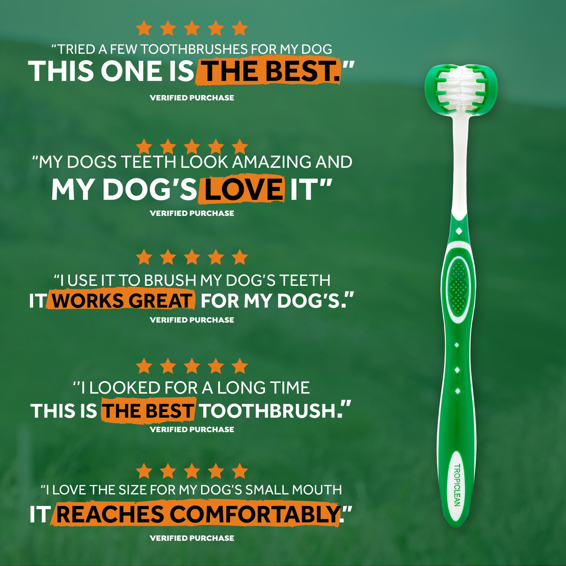 Why brush with one set of bristles when you can brush with three? TropiClean Fresh Breath TripleFlex™ Toothbrush contains three sides of bristles to give the teeth a 360-degree clean, ensuring that no surface is left uncleaned. Brush away plaque and tartar 3X faster when paired with Fresh Breath Brushing Gel. Give your pet the dental care they deserve by repeating brushing sessions weekly. Small and medium brush is sized specifically for dogs with smaller mouths and teeth (brush is 71/2″ long with a 11/8″ brush head).