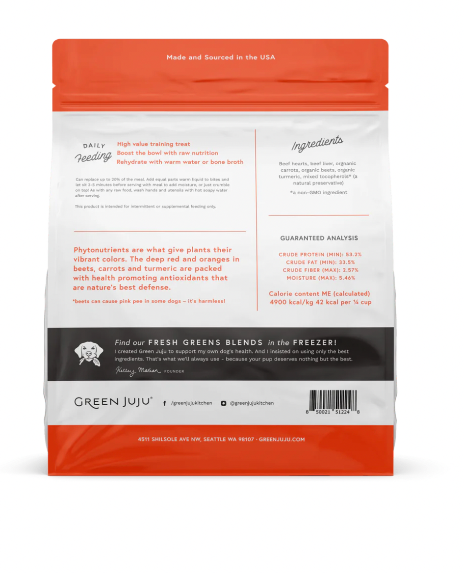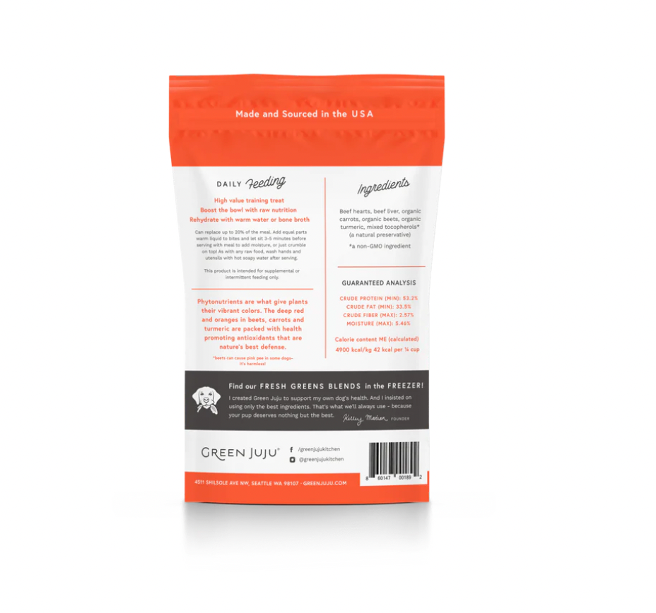 - Made with grass-fed Pacific Northwest beef organs with organic beets, organic carrots, and organic turmeric.