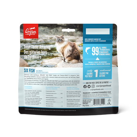 Treat your cat to nutritious and delicious ORIJEN® Freeze-Dried Treats. Packed with animal protein, our Six Fish Recipe is made with 99% animal ingredients* including a variety of nourishing wild-caught fish. Freeze-dried to lock in their rich nutrients and flavor, they’re packable and perfect for adventures. At just one calorie each, ORIJEN Freeze-Dried Treats are loaded with protein and amazing taste.