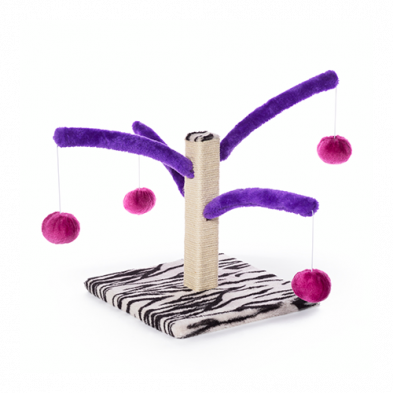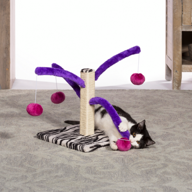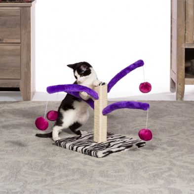 Interactive toy for your cat or kitten. Jute rope scratching post offers an appealing texture to cats, curbing inappropriate scratching behaviors. Four plush fabric covered springs bounce and bend. Four plush, dangling, swat toys encourage kitty to play.