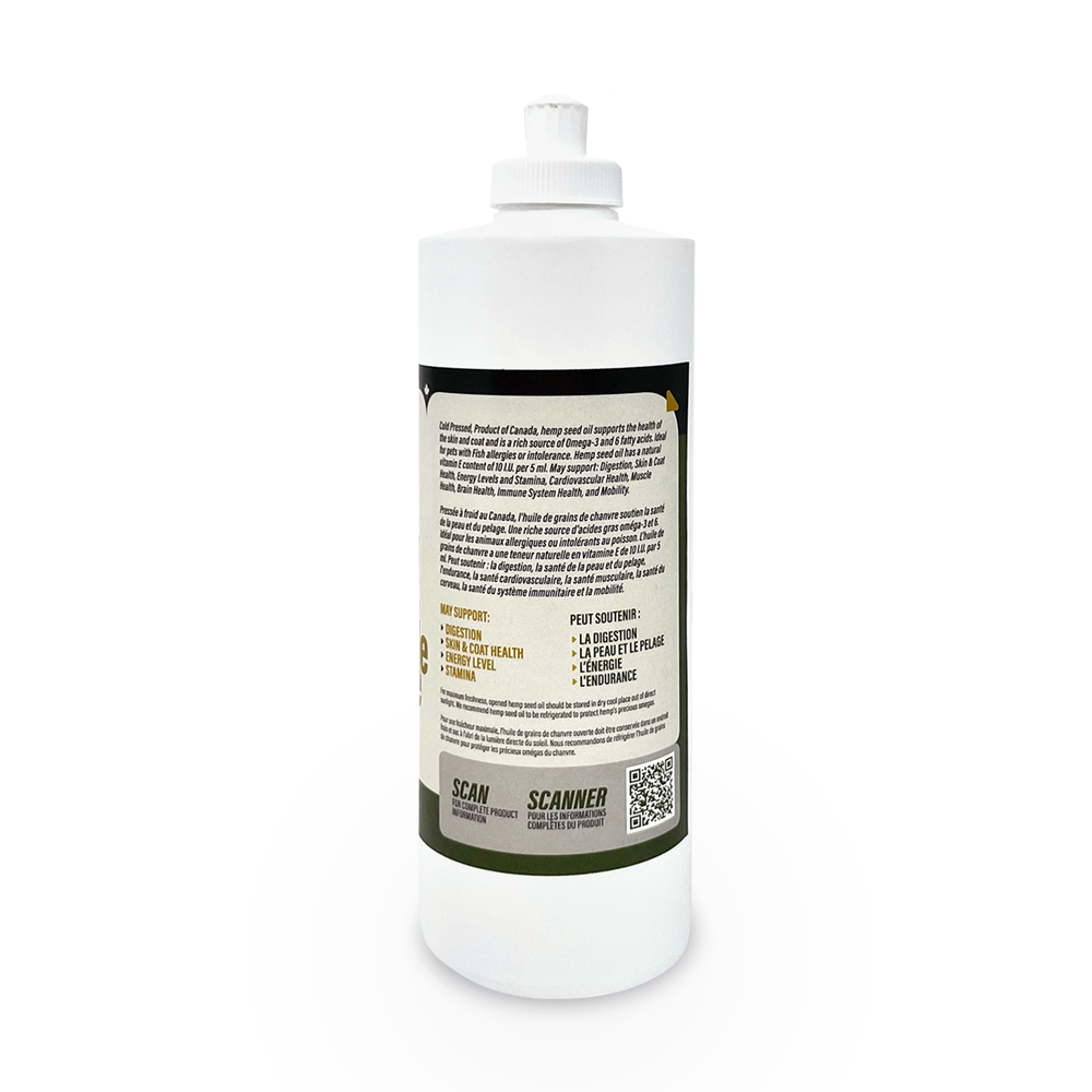 Cold Pressed, Product of Canada, hemp seed oil supports the health of the skin and coat and is a rich source of omega-3 and 6 fatty acids. Ideal for pets with Fish allergies or intolerance. Hemp seed oil has a natural vitamin E content of 10 I.U. per 5 ml. May support: Digestion, Skin & Coat Health, Energy Levels and Stamina, Cardiovascular Health, Muscle Health, Brain Health, Immune System Health, and Mobility