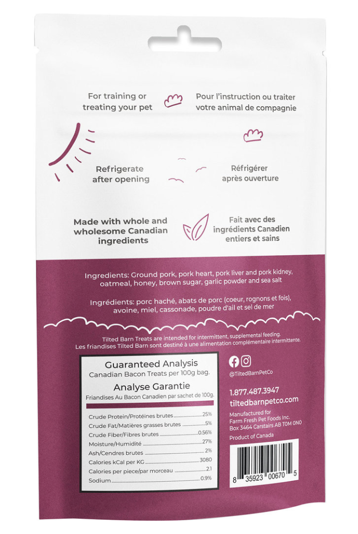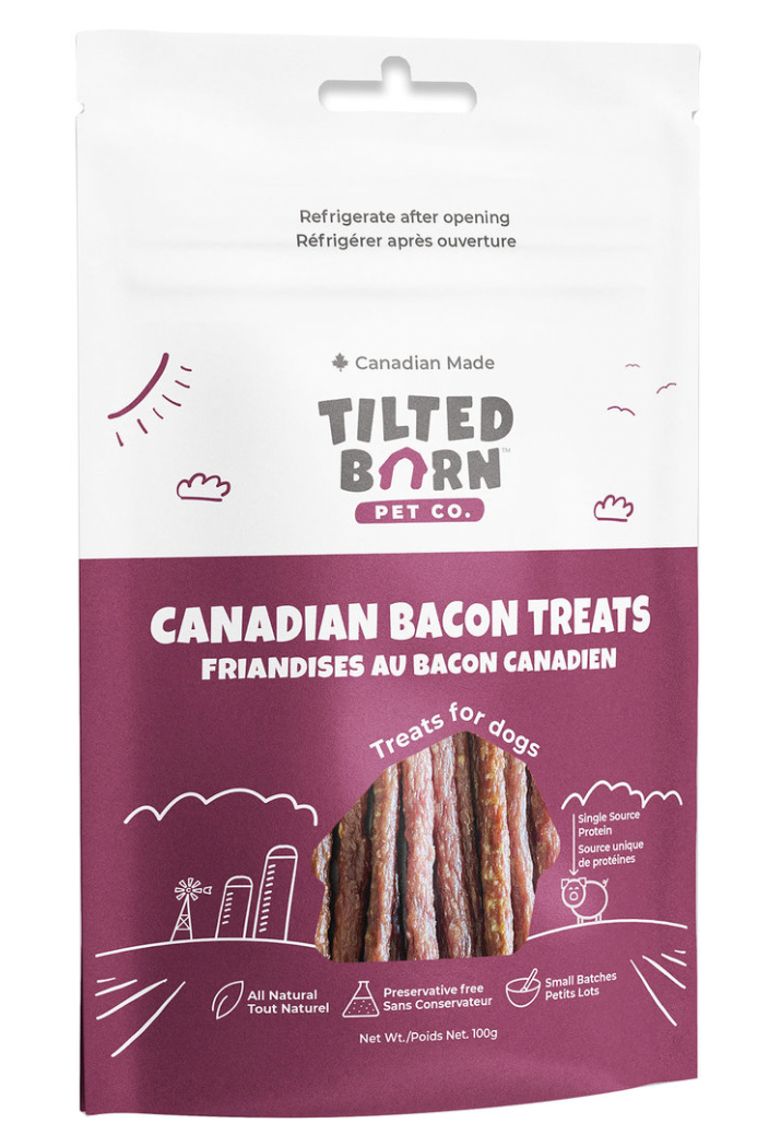 The Canadian Bacon Titled Barn Treats are healthy, soft meaty treats for dogs of all ages and sizes. The treats are preservative-free and contain no fillers or by-products. The single-source protein treats are made with all-natural, high-quality, whole ingredients from the human food market sourced from across the Canadian Prairies, and are 100% Canadian-made.