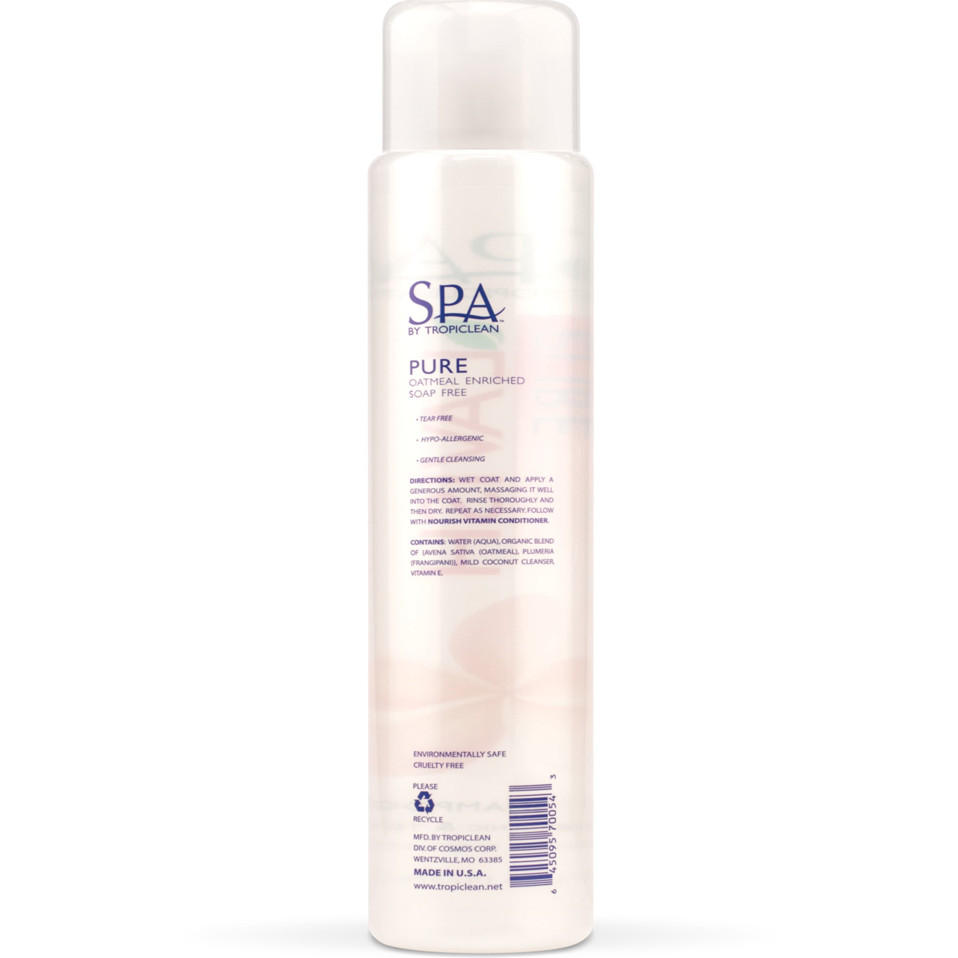 SPA by TropiClean Lavish Pure Pet Shampoo is a tearless, hypoallergenic, and soap-free shampoo perfect for pets with sensitive skin. Enhanced with fragrant notes of plumeria, salt water, pineapple, and coconut, Pure Pet Shampoo creates a luxurious grooming experience right at home. Shampoo is oatmeal enriched and soap free for a gentle and safe clean for dogs and cats 12 weeks and older.