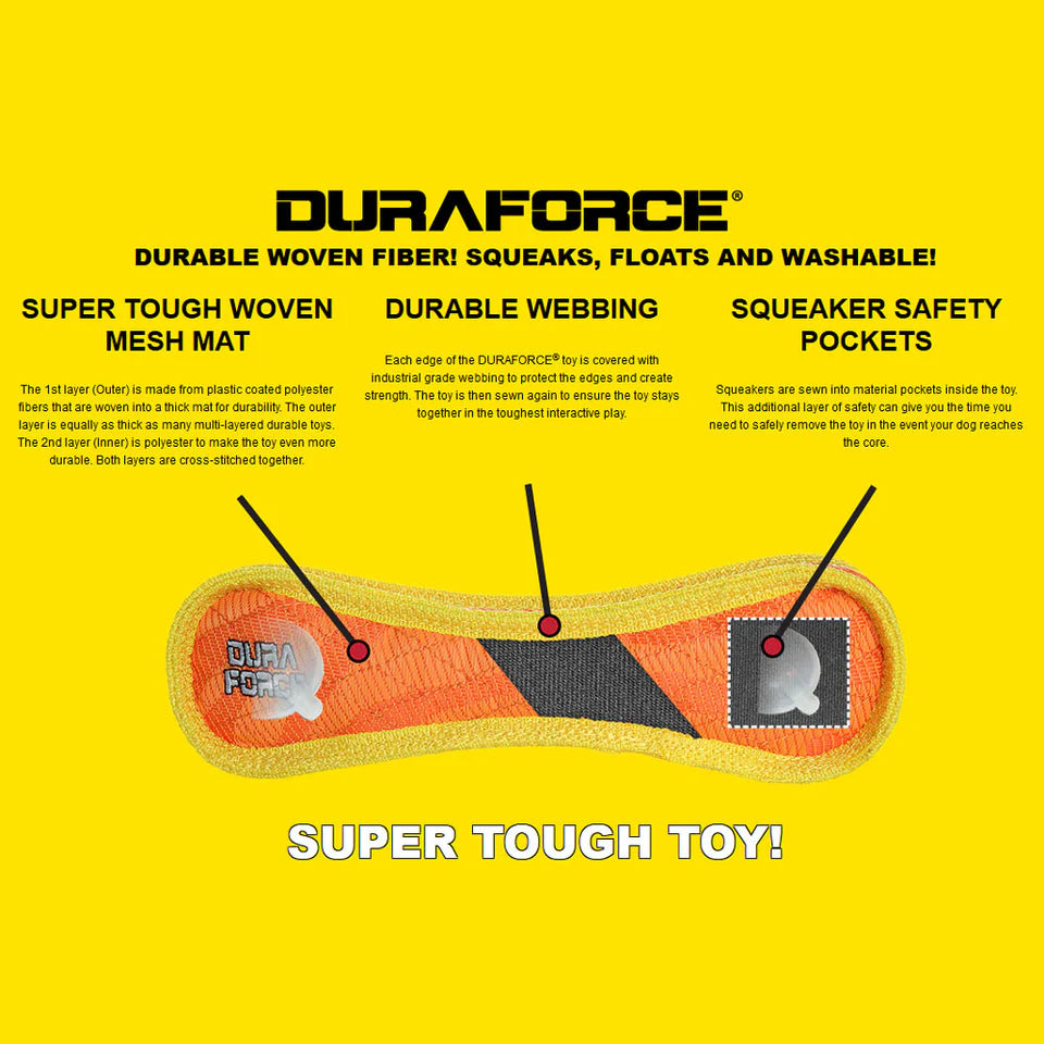 Tuffy Dog Toys - DuraForce Bones are made with durability in mind! The outer layer is made from plastic-coated polyester fibers that are woven into a thick mat for durability. The inner layer is made from polyester. Both layers are cross-stitched together to create strength. Each edge of the DuraForce toy is covered with industrial-grade webbing to protect the edges. The toy is then sewn again to ensure it stays together in the toughest interactive play. Squeakers are sewn inside protective pouches for your dog’s safety.