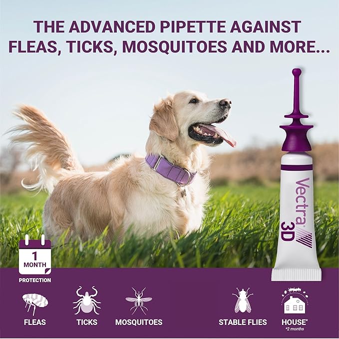 Vectra 3D is a vet-quality, once-a-month topical parasite treatment for dogs and puppies now available for Pet Retail. With a unique, fast-acting formula, it acts against ticks, fleas, mosquitoes and more, even before they bite. With an innovative and patented tip design, that allows for quick-and-easy application using the “line-on method”, Vectra 3D 1) kills ticks for 1 month; 2) against fleas, it starts working within 2 hours, kills within 6 hours of infestation, and prevents future infestations for 1 month; and 3) repels mosquitoes, and some other flying parasites, for 1 month. Vectra 3D monthly treatments remain effective after swimming and bathing*. Available in 4 sizes, to accommodate most popular dog sizes, each including 3 once-a-month doses. (*Swimming once per week/up to two bathings.)